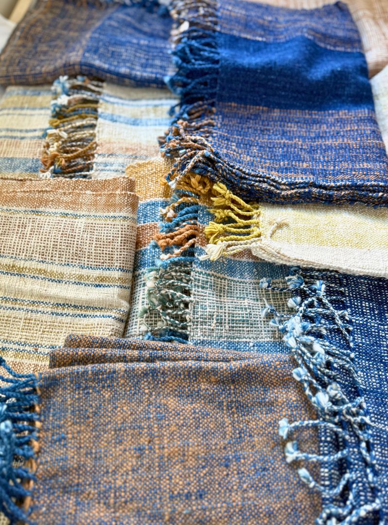 The colours come straight from nature: leaves, bark, wood and seasonal plant dyes create warm browns, soft creams and muted blues. Each batch varies slightly, shaped by weather, harvest and time — making every scarf genuinely one of a kind.